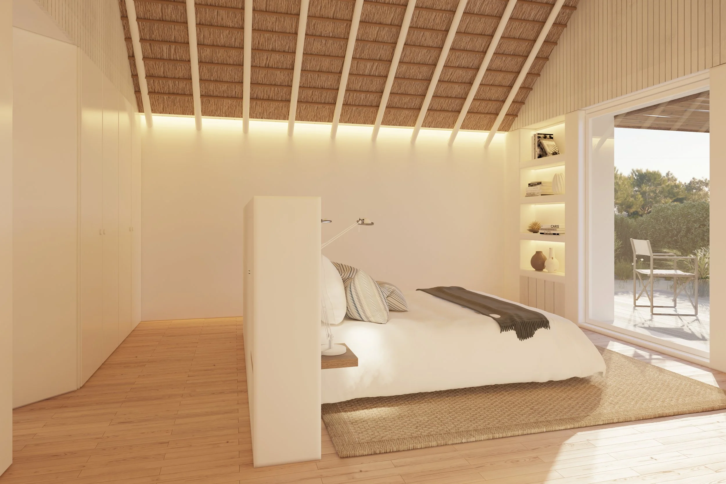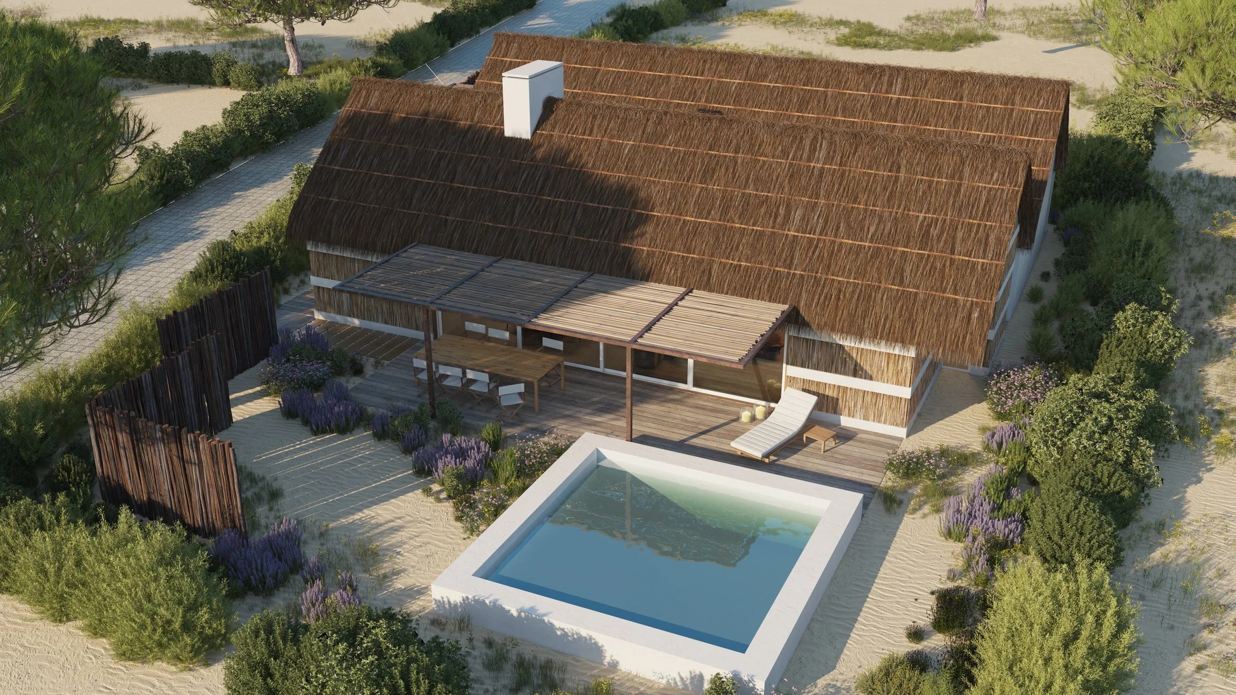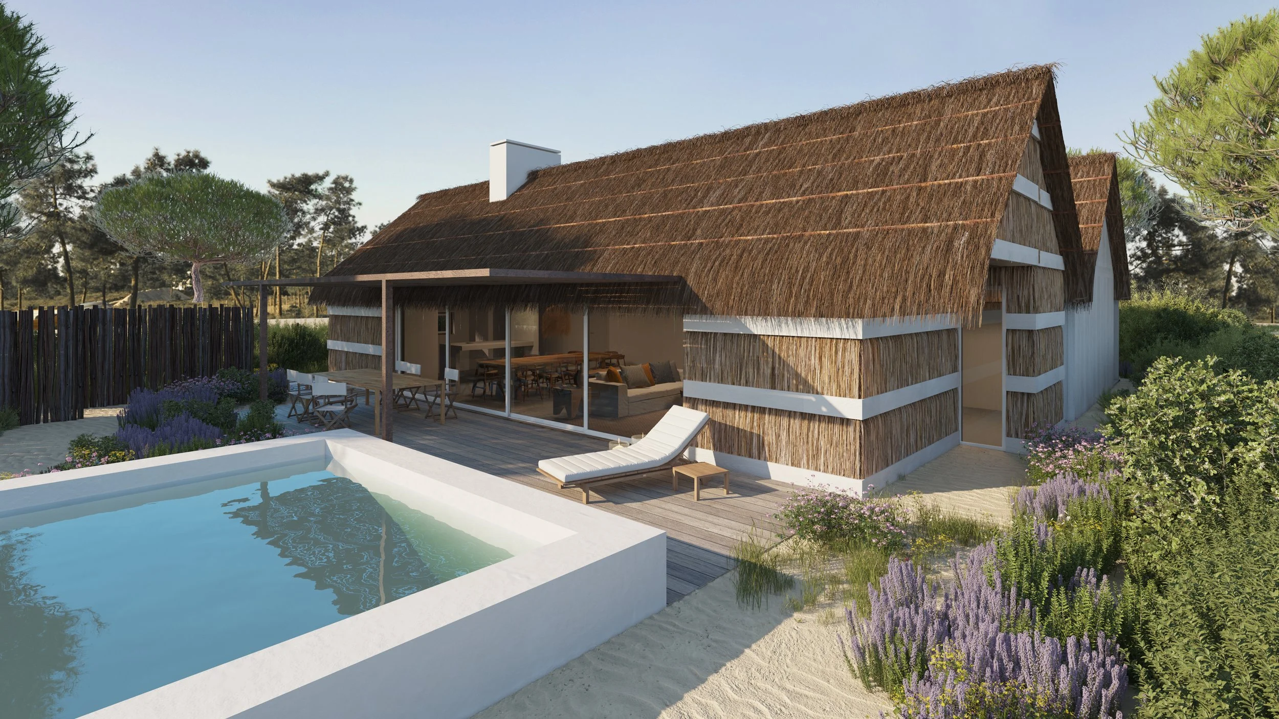 Located in one of Herdade da Comporta’s most exclusive areas, this residential project comprises three T4 villas on 500 m² plots, designed by GSS — Gonçalo Salazar de Sousa. Inspired by the region’s traditional architecture, the homes combine wood, thatch, and contemporary lines, featuring high-end, Comporta-style finishes. Each villa includes four en-suite bedrooms, a spacious living room with fireplace, and generous outdoor areas with a deck and private pool. Just a short walk from the beach and one hour from Lisbon, the villas will be delivered in June 2026.